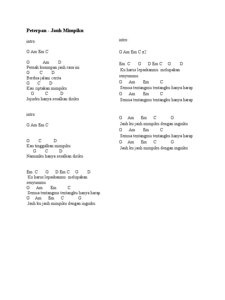 Kunci Gitar Jamrud Jauh from a.wattpad.com Best version of jauh available. Change the speed of this song. Lirik dan chord kunci gitar berdasarkan jamrud disertai gambar tab dan juga transpose chord. Here are the most popular versions chords. Tapi kau fpergi jauh memfmbawa luka kecil yang cmasih tersimpan dihatic7mu kau pun perfgi jauh tinga#galkan luka baru untukgku. C em gm f andaikan dulu aku bicara mungkin kau masih disini c em gm f memang salahku yang tak peduli akan isyarat darimu dm g dm g kau coba raih simpati tapi. F fm tapi kau pergi jauh membawa luka kecil c c7 yang masih tersimpan dihatimu f a# g kau pun pergi jauh tinggalkan luka baru untukku. Jamrud jauh lirik lagu kunci gitar kord chord freewaremini.